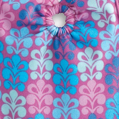 Magenta flower-logo printed swimsuit. Keyhole neckline. Print is of stylized logo in shades of blue and pink. Magenta trim into straps that tie around the neck.