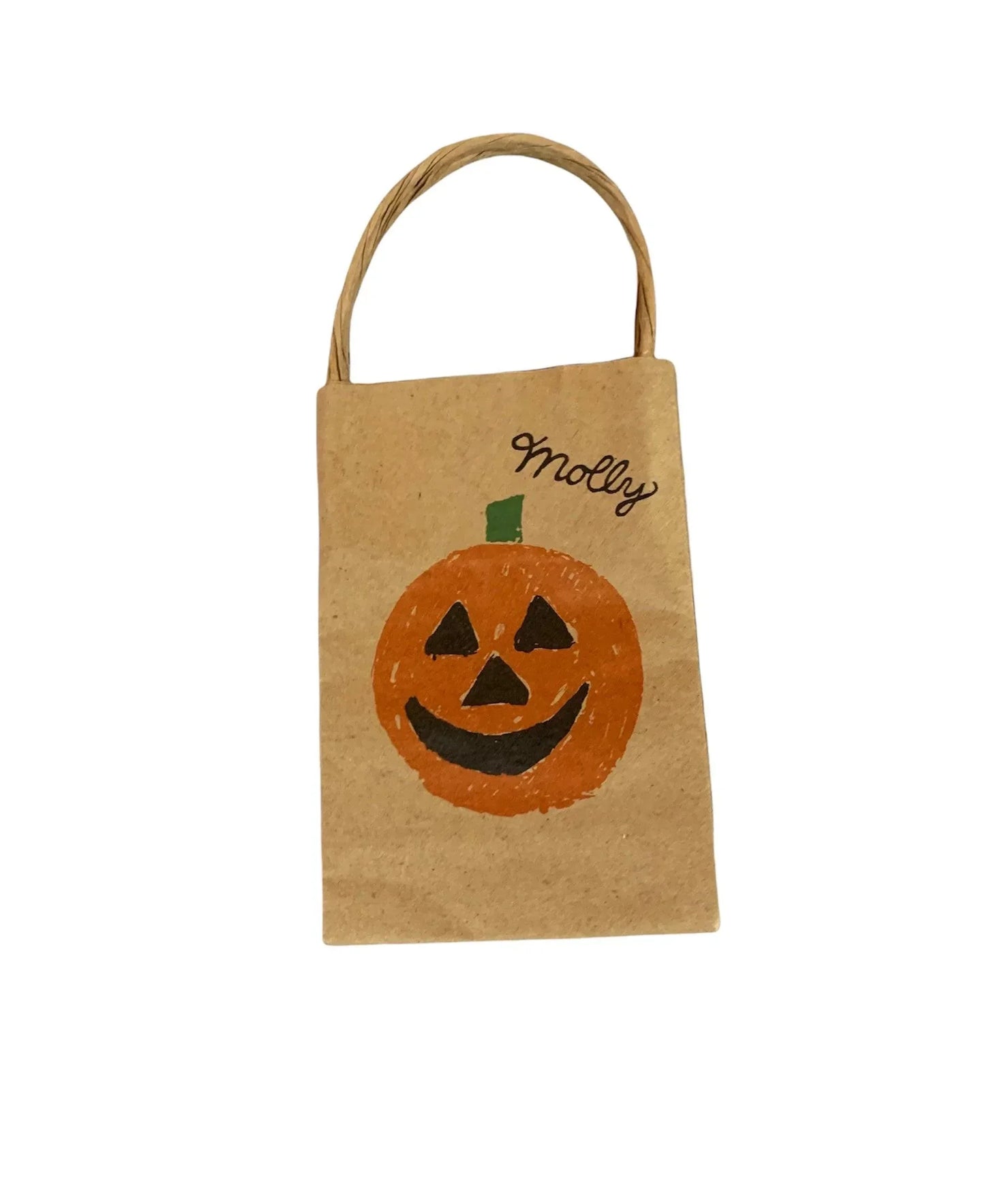 - A paper treat sack decorated with a jack-o'-lantern